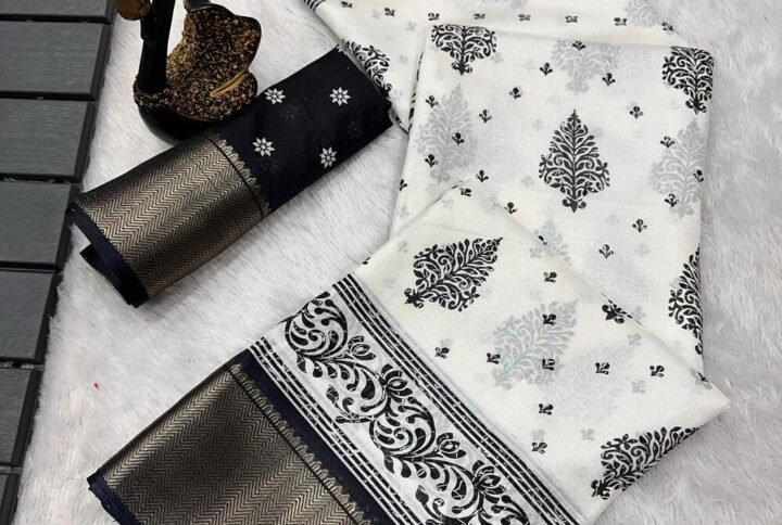 This stunning ensemble includes a prominent blouse piece that adds a touch of sophistication to your look. Perfect for special occasions or formal events, this saree exudes elegance and grace.